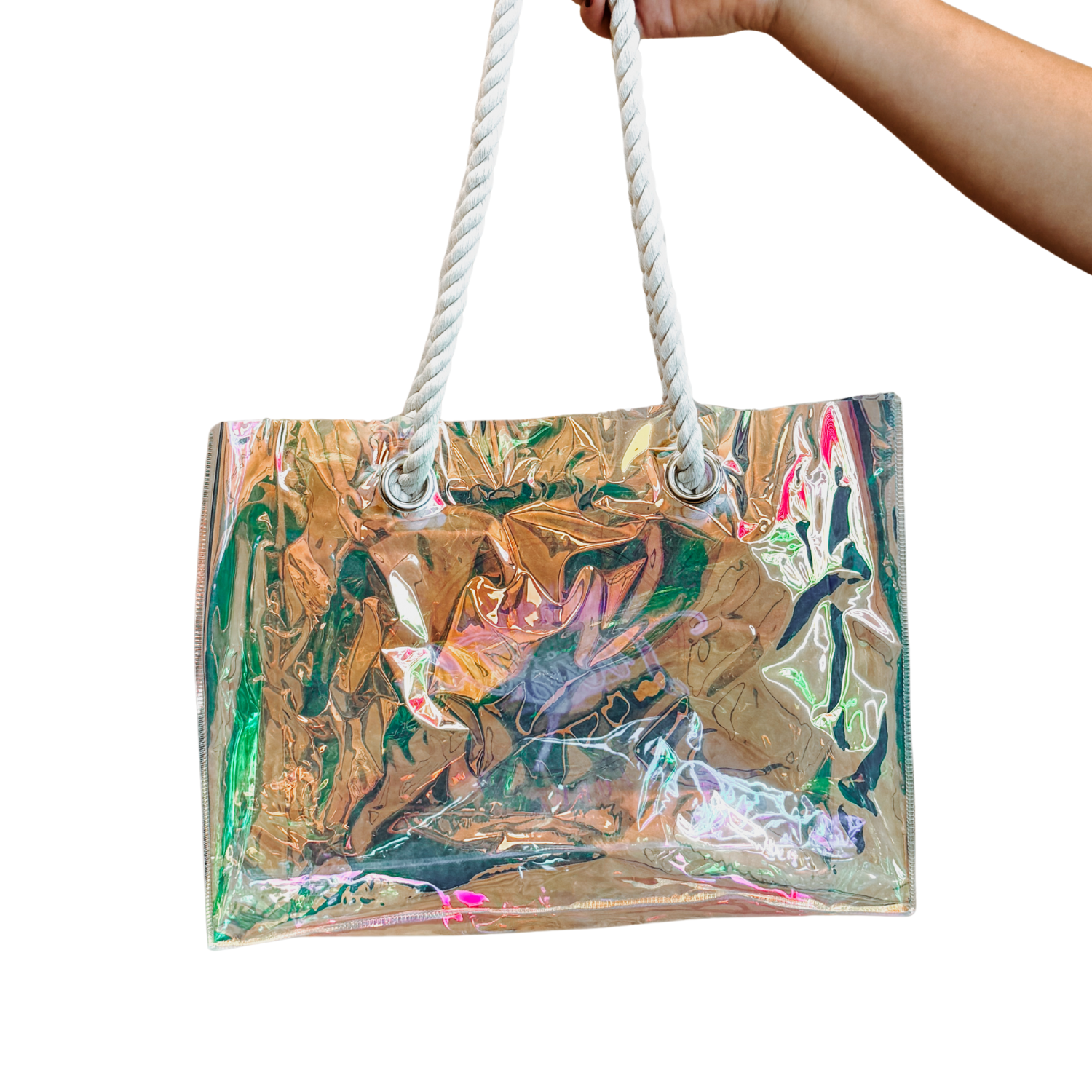 Turn heads while carrying all your essentials with ourย Thistle Holographic Tote. With its iridescent finish that catches the light at every angle, this tote is equal parts functional and eye-catching.